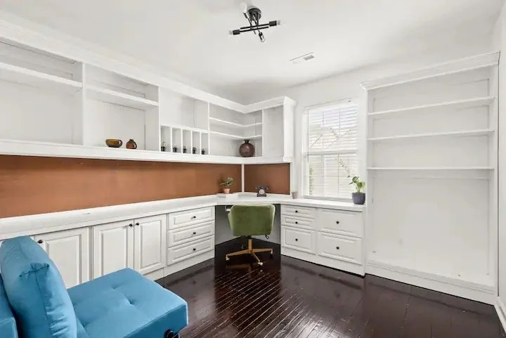 A customized office with built-ins spanning two walls, including file drawers, endless shelving, and incredible counter space. Fiberoptic internet completes the picture for private Zoom meetings and all you’d need for spacious work from home.